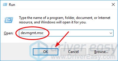 - On your keyboard, press the Windows logo key and R (at the same time) to invoke the Run box. Type devmgmt.msc and click OK.