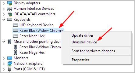 - Uninstall all your Razer devices. They may probably be located under the Razer Device, Human Interface Devices, Keyboards, Mice or other pointing devices sections.