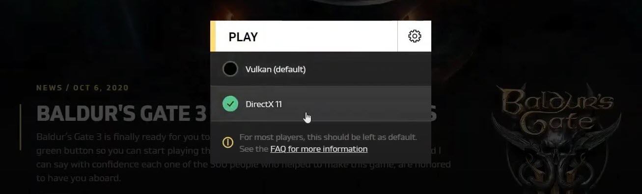 The default API for Baldur’s Gate 3 is Vulkan 1.1 and DirectX11 is also provided in this game. Switching from Vulkan to DX11 proved to be working for many players. Hopefully, this will work for you too.