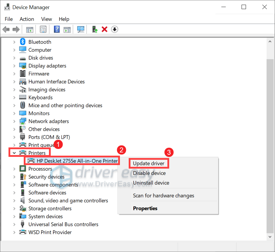 - Double-click on Printers to expand the list. Then right-click your device and select Update driver.