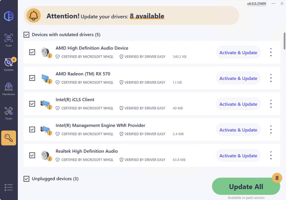 3) Click the Activate & Update button next to any flagged device or click Update All to update all the outdated drivers. You can sign up for the free trial to update drivers with no upfront cost.