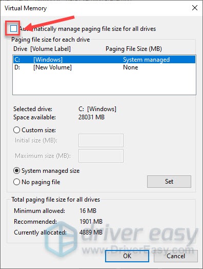 Note: According to Microsoft, you should set virtual memory no less than 1.5 times and no more than 3 times the amount of RAM on your computer. For example, if you have 8 GB RAM, the Initial size should be 8 x 1024 x 1.5 = 12288 MB while the Maximum size should be 8 x 1024 x 3 = 24576 MB. If you don’t know how much RAM you have, read our post to check RAM on your computer.