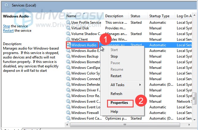 - Right-click on Windows Audio and select Restart from the pop-up menu. Then the audio service will restart.