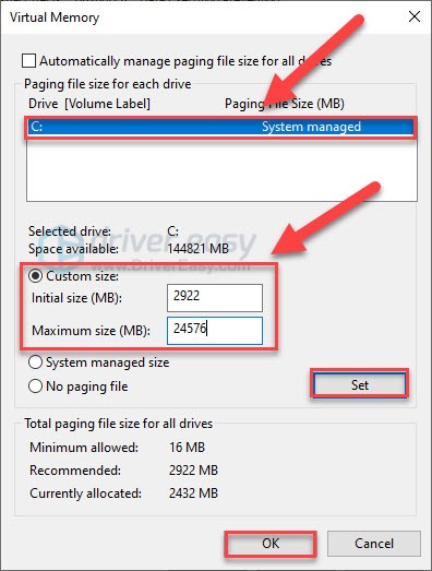 Once you’ve entered your virtual memory values, click Set, then click OK to continue.