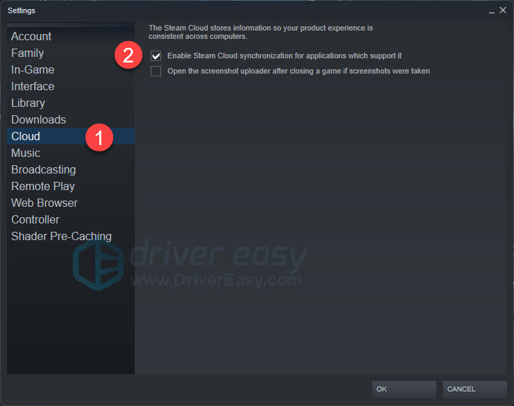 - From the Steam client Settings window, navigate to the Cloud tab.