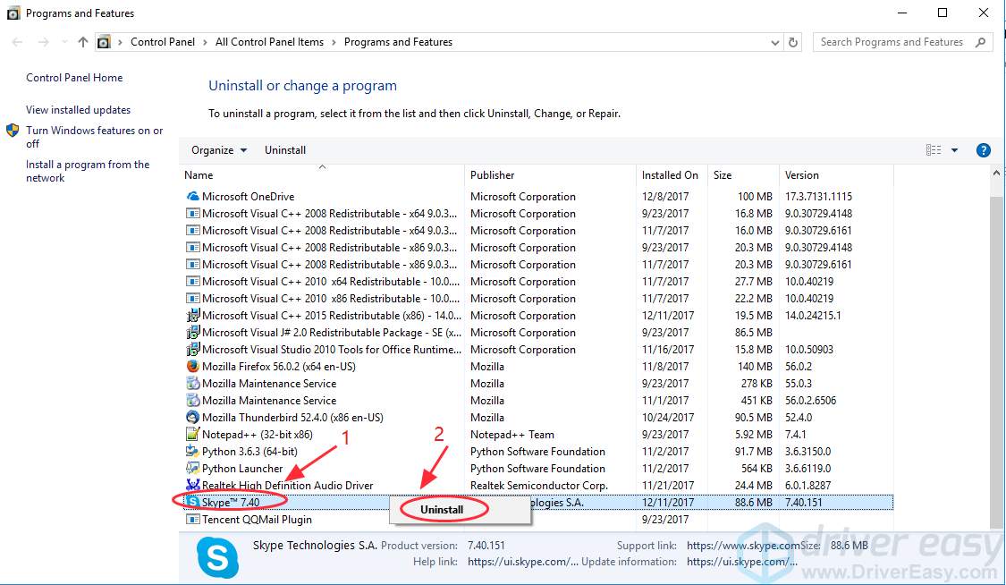 Right click the program that gave the error (in my case it’s Skype), then select Uninstall.