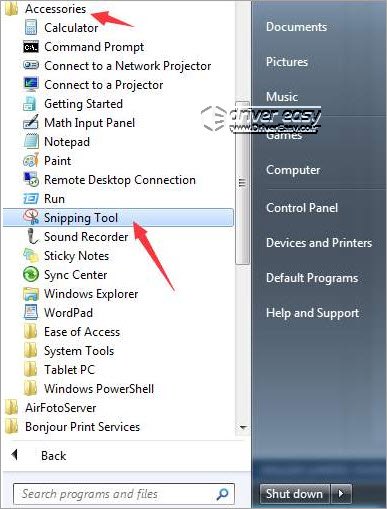 2) Navigate to All Programs -> Accessories. Then click Snipping Tool. (See below screenshot)