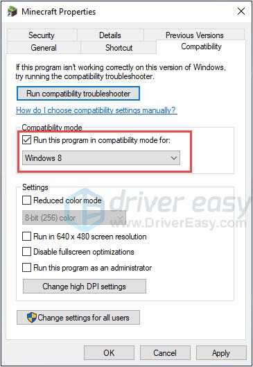 Games that were created for earlier versions of Windows will work in the recent version of Windows 10, but some may run poorly or not launch at all. Compatibility mode allows games to use settings from an earlier version of Windows which can help you solve the Minecraft won’t launch issue.