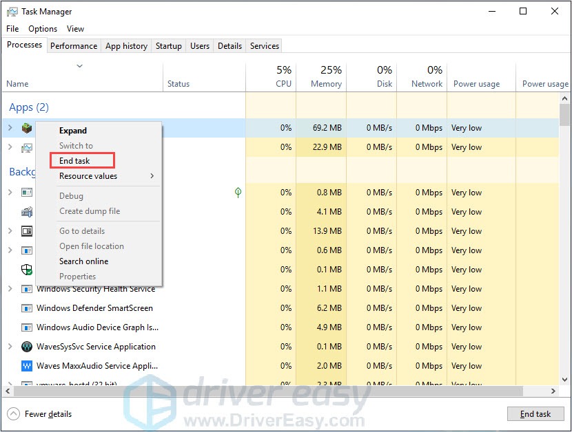 2. In the Processes tab, right-click on the Minecraft and choose End task