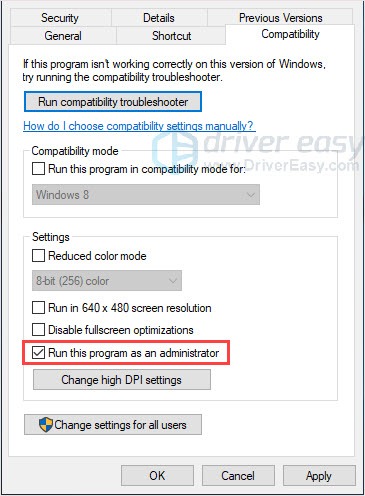 - Click Compatibility tab and check Run as Administrator.