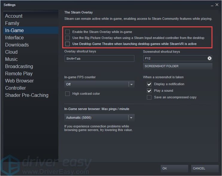 - Choose the In-Game tab, uncheck these boxes to disable the Overlay options. Then click OK.