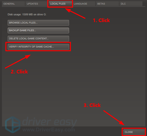 - Click the LOCAL FILES tab, then click VERIFY INTEGRITY OF GAME CACHE…. After that, click CLOSE.