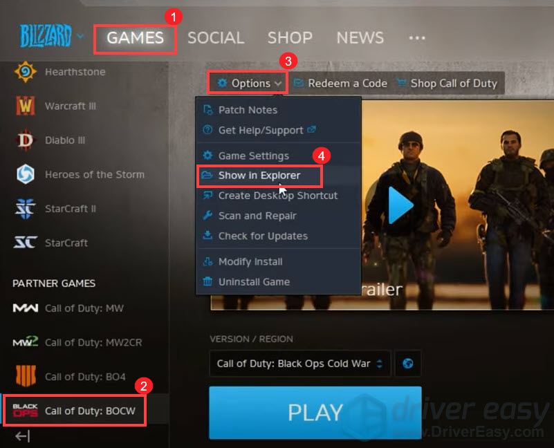 - Click on GAMES and head to Call of Duty: BOCW. Click on Options > Show in Explorer. Then you’ll be brought to your game’s installation directory.