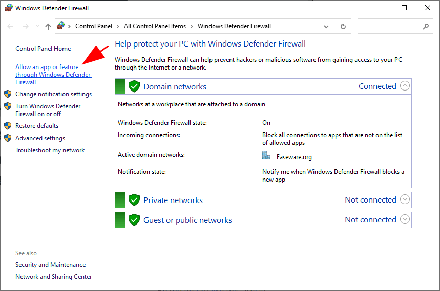 - In the window that pops up, click Allow an app or feature through Windows Defender Firewall.