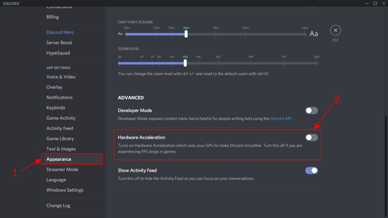 - In the left pane, scroll down to Appearance. Then in the right pane, scroll down to Hardware Acceleration and make sure it’s turned off.