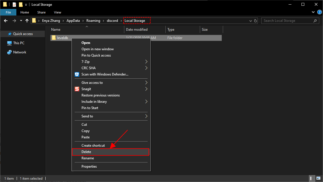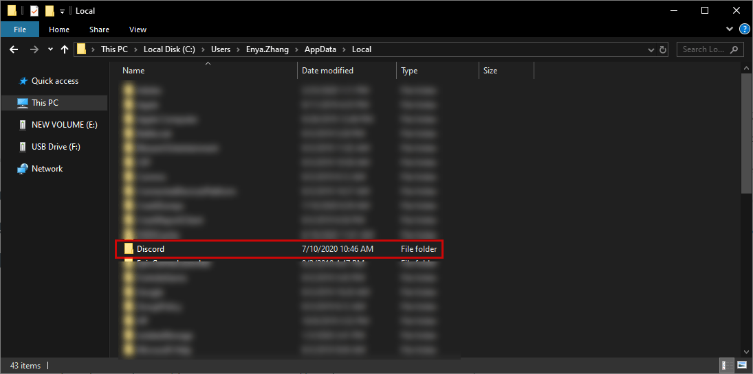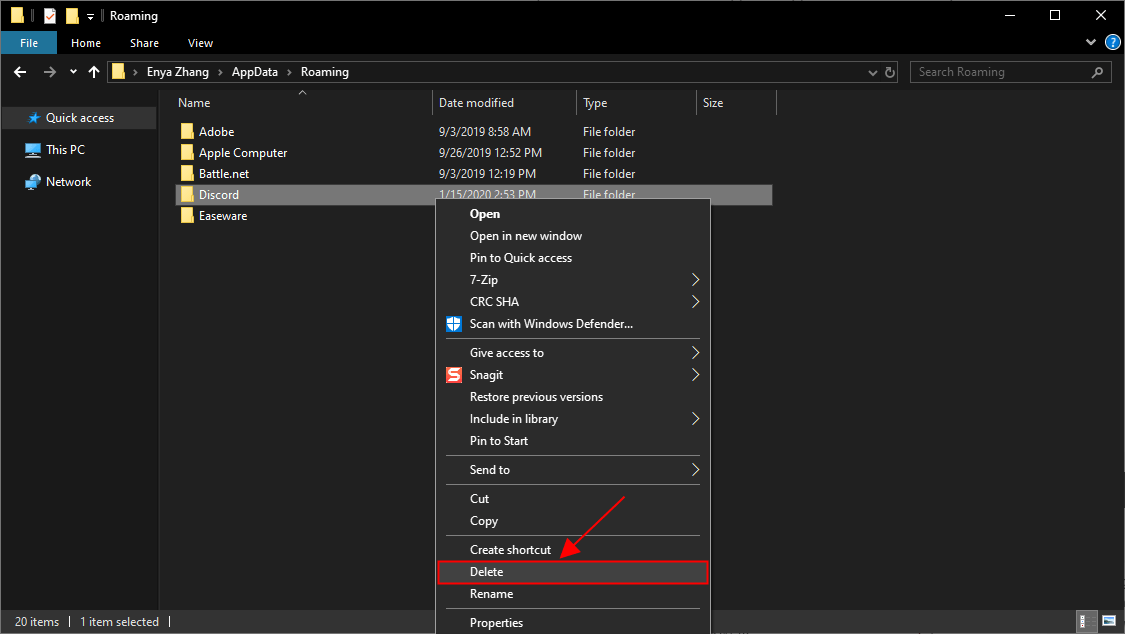 - Locate the Discord folder, then right-click on it and select delete the delete the whole folder.