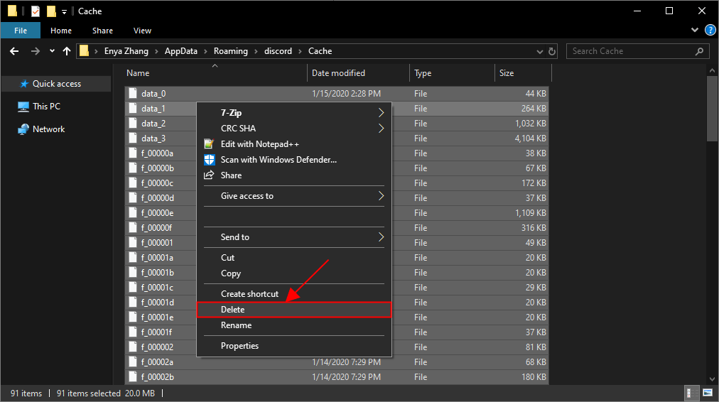 - Inside the Cache folder, press Ctrl and A at the same time to select all the files, then right-click and select Delete.