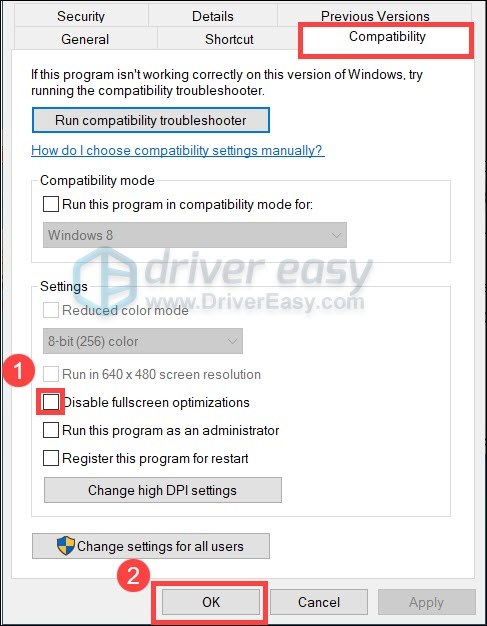 - Navigate to the Compatibility tab. Under the Settings section, check the box next to Disable fullscreen optimizations. Then click OK.