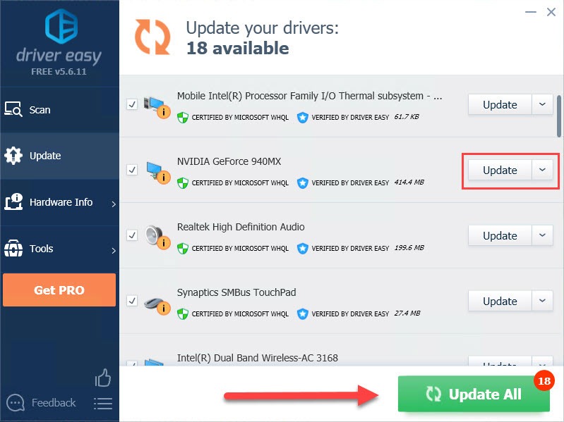 Or click Update All to automatically download and install the correct version of all the drivers that are missing or out of date on your system. (This requires the Pro version which comes with full support and a 30-day money back guarantee. You’ll be prompted to upgrade when you click Update All.)