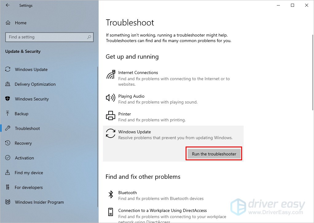 - Under Troubleshoot tab click Windows Update and then click Run the troubleshooter.