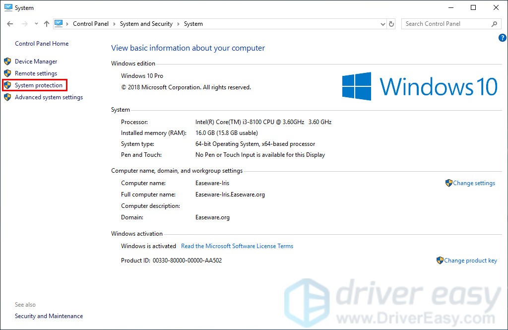 - On your keyboard, press the Windows logo key + Pause together, then click System protection.