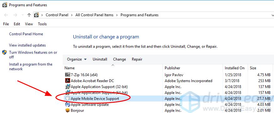 - In the program list, check if you see Apple Mobile Device Support installed.