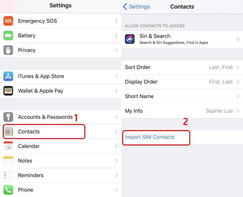 3) On your new iPhone, tap Settings > Contacts > Import SIM Contacts.