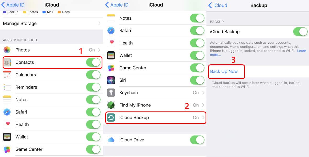 2) Make sure the Contacts option is toggled on. Then scroll down a little bit to tap iCloud Backup. Then tap Back Up Now.