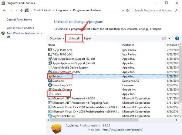 2) Select both iTunes and Bonjour, click Uninstall