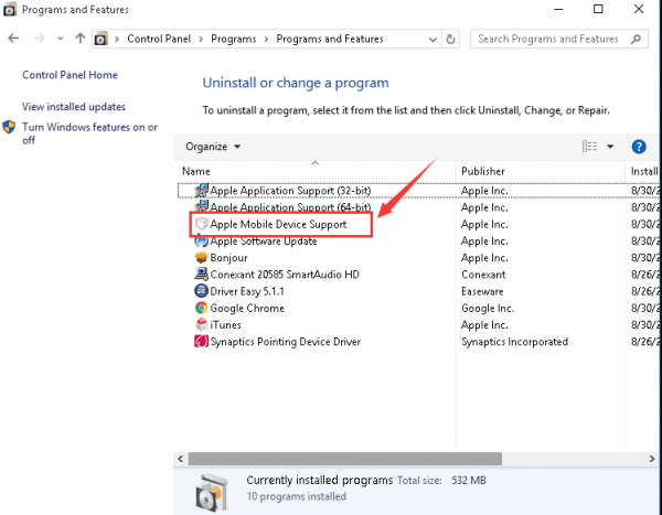 2) See if the option Apple Mobile Device Support is listed. If not, you need to reinstall iTunes on your computer.  3) On your keyboard, press the Windows logo key and R at them same time, then type in services.msc and press Enter 4) Double-click Apple Mobile Device or Apple Mobile Device Service