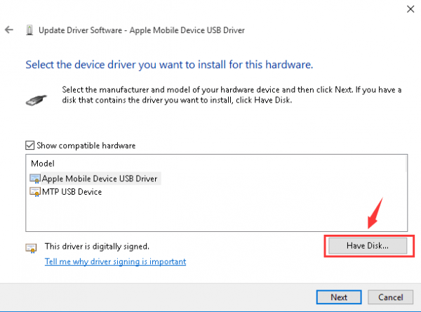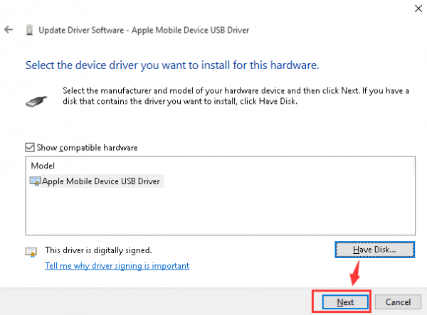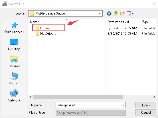 7) Double-click the usbaapl file. If you have a 64-bit version of Windows, this file will be called usbaapl64. If you don’t see usbaapl64 here or if there isn’t a Drivers folder, look in C:\Program Files (x86)\Common Files\Apple\Mobile Device Support\Drivers.  8) You will be lead back to Install From Disk window. Click OK Click Next 9) Windows will install the driver. If it prompted to say that the software that you are installing has not passed Windows Logo testing, click Continue Unplug your iPhone 7, then reconnect it using USB cable. Open your iTunes and see if your iPhone 7 can be detected or recognized by iTunes.