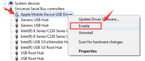 If you see a down arrowhere next to the device name, then this device is disabled. Please right-click Apple Mobile Device USB Driver and click Enable Note: If you cannot see any sign next to Apple Mobile Device USB Driver, please check if there is a third party software conflict.