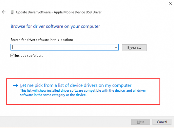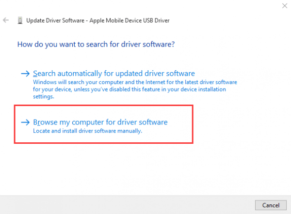 This method is adopted when you see a  or by the Apple Mobile Device USB Driver 1) Make sure that you have quit iTunes if it opens. Then connect your iPhone to the computer.  2) Go to Device Manager. Expand Universal Serial Bus controllers and double-click Apple Mobile Device USB Driver If Apple Mobile Device USB Driver option cannot be found under category Universal Serial Bus controllers, but under Portable Devices, please go to Method Five: Update iPhone 7 Driver.  3) Click Browse my computer for driver software 4) Click Let me pick from a list of device drivers on my computer 5) Click Have Disk… 6) Click Browse Go to C:\Program Files\Common Files\Apple\Mobile Device Support\Drivers