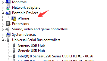 This method applies when you see your iPhone, with a yellow exclamation mark next to it, listed under Portable Device rather than Universal Serial Bus controllers