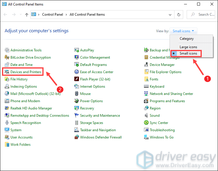 3) Select Small icons from the drop-down menu next to View by. Then, click Devices and Printers.