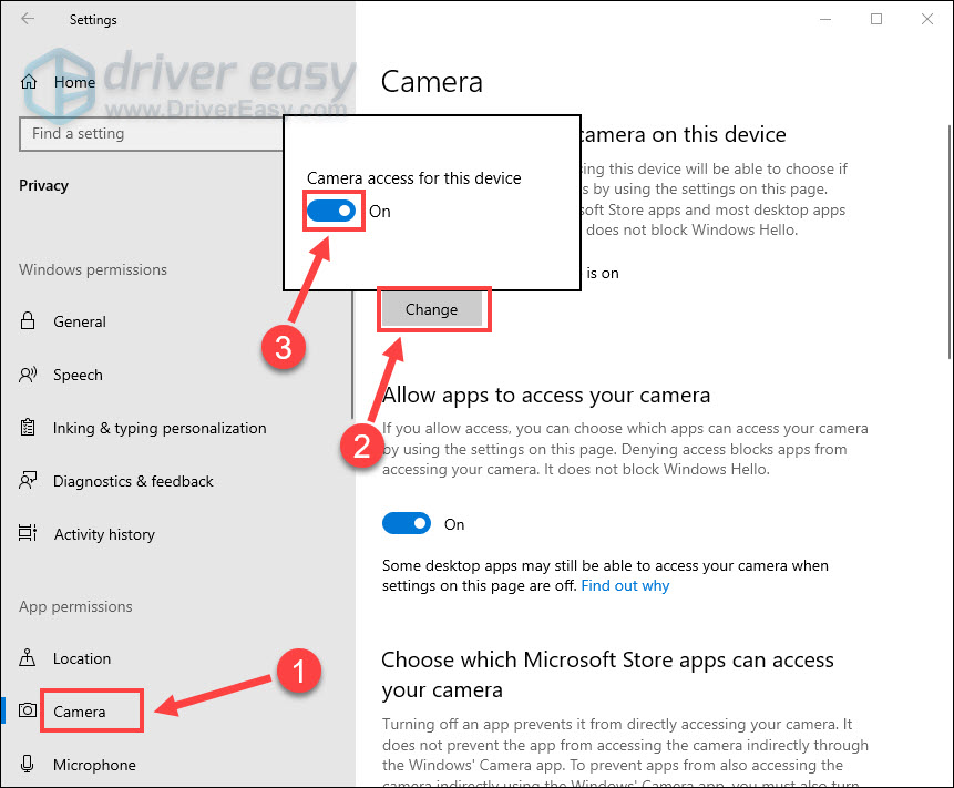 - Navigate to the Camera tab. Then click the Change button and turn on the Camera access for this device.
