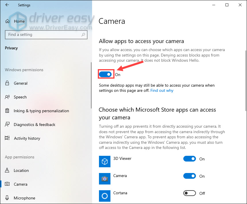 - Toggle on the button under Allow apps to access your camera.