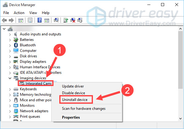 - Right-click Integrated Camera and select Uninstall device.