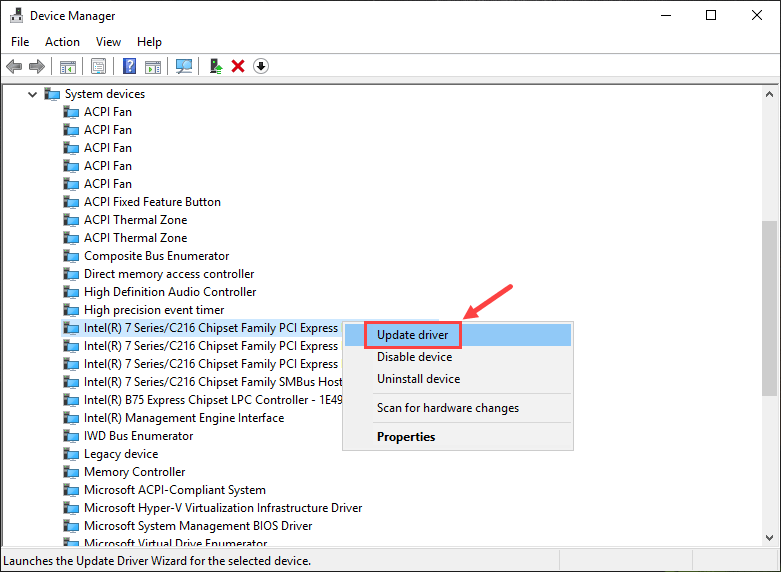 5) After updating your keyboard drivers, you should now make similar changes to the chipset drivers. In Device Manager, double-click System devices to expand its drop-down list.
