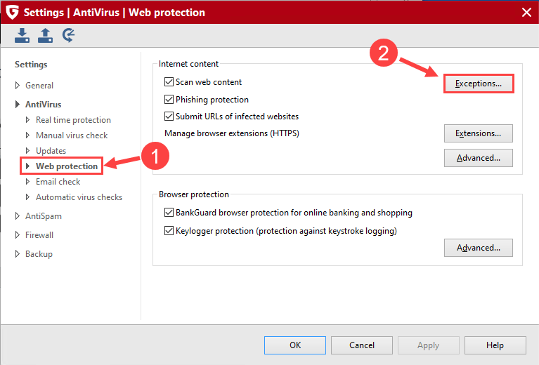 2) Navigate to the Web protection tab, then click Exceptions… next to Scan web content.