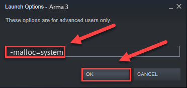 Fix 6: Launch Arma 3 with the malloc=system command