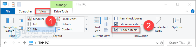 3) Click the View tab, then check the box next to Hidden items.