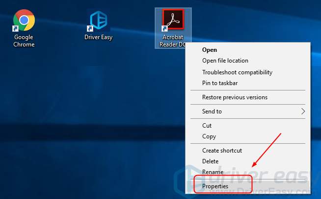 1) On your desktop, right-click on the shortcut of your Acrobat Reader and click Properties.