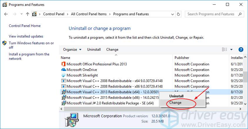 3) Right-click on Microsoft Visual C++ 2013 Restributable and click Change.