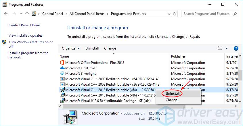3) Right-click on Microsoft Visual C++ 2013 Restributable and click Uninstall.