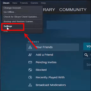 - Launch Steam. Click Steam on the top-left corner and select Settings.