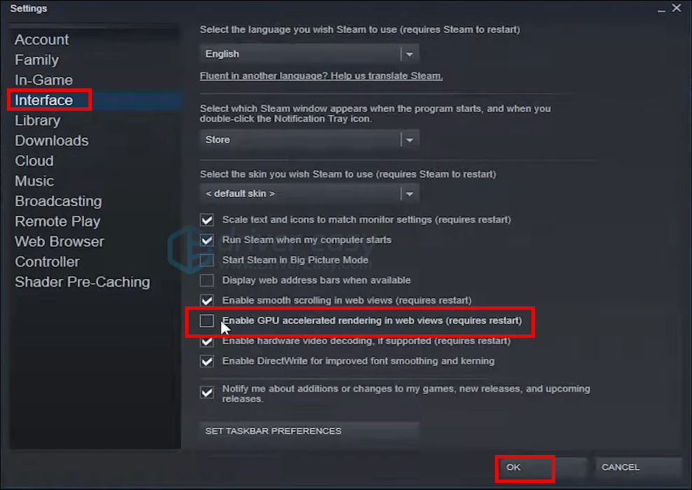 - Select Interface, then uncheck the box for Enable GPU accelerated redering in web views (requires restart), then click OK.
