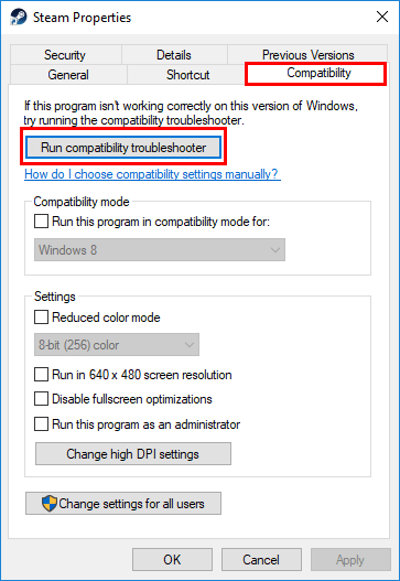 - Compatibility mode: If your Steam client keeps crashing on your current Windows system, click the drop-down list to select a previous version of Windows system to test-run it.