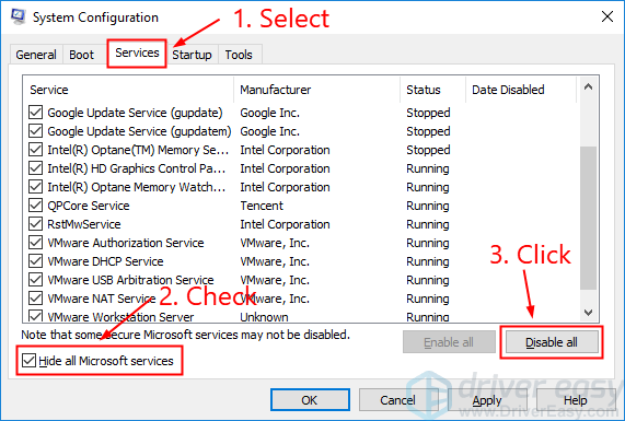 - Select the Services tab, check Hide all Microsoft services, and then click Disable all.