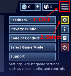 1. In Fortnite, click the menu button in the upper-right corner, then select the gear icon to open the game settings.